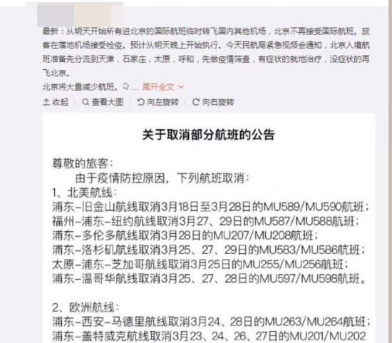 3月17日晚,网上有消息称,“从明天(18日)开始所有进北京的国际航班临时转飞国内其他机场,北京不再接受国际航班。旅客在落地机场接受检疫。预计从明天晚上开始执行。今天民航局紧急视频会通知,北京入境航班准备先分流到天津,石家庄,太原,呼和,先做疫情筛查,有症状的就地治疗,没症状的再飞北京。”