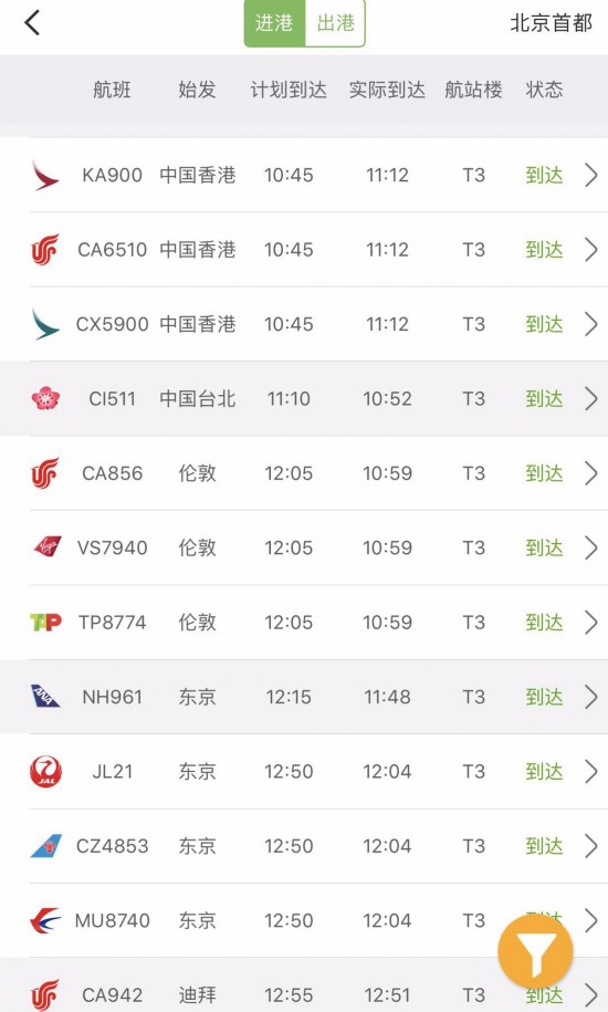 ↑北京首都机场3月18日截至13:00国际进港航班(部分)