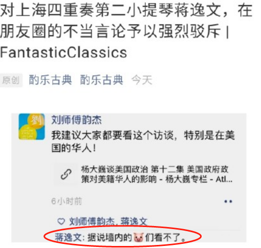 近日有网友爆料称,蒋逸文在刘韵杰的朋友圈文章下留言,发表不当言论,称中国人是“猪”。
