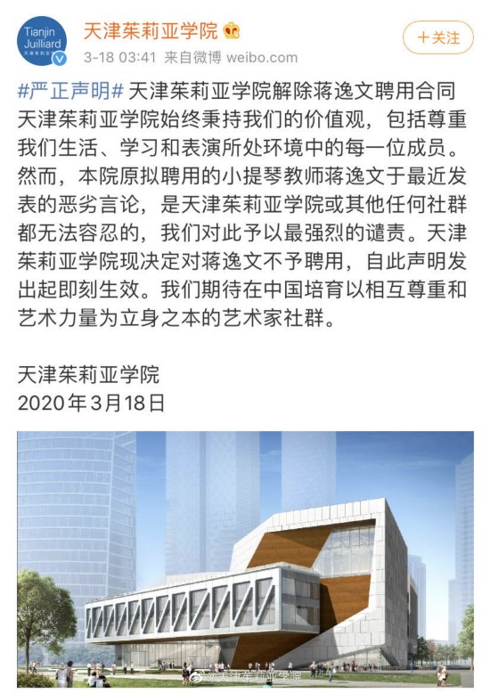 今天(18日)凌晨3时许,天津茱莉亚学院在官方微博发布严正声明宣布解除蒋逸文聘用合同。
