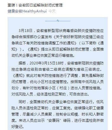 据悉,2020年3月15日18时,安徽省新冠肺炎疫情防控应急响应级别由省级二级响应调整为省级三级响应。《通知》就此对有关防控措施进行了调整,首先是解除封闭式管理,优化小区村庄疫情管控。按照高中低风险人员划分,有针对性地落实小区(村庄)进出人员管控措施。对低风险人员,经体温检测正常的,可自由进出。