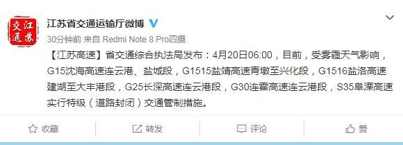 【江苏高速】省交通综合执法局发布:4月20日06:00,目前,受雾霾天气影响,G15沈海高速连云港、盐城段,G1515盐靖高速青墩至兴化段,G1516盐洛高速建湖至大丰港段,G25长深高速连云港段,G30连霍高速连云港段,S35阜溧高速实行特级(道路封闭)交通管制措施。
