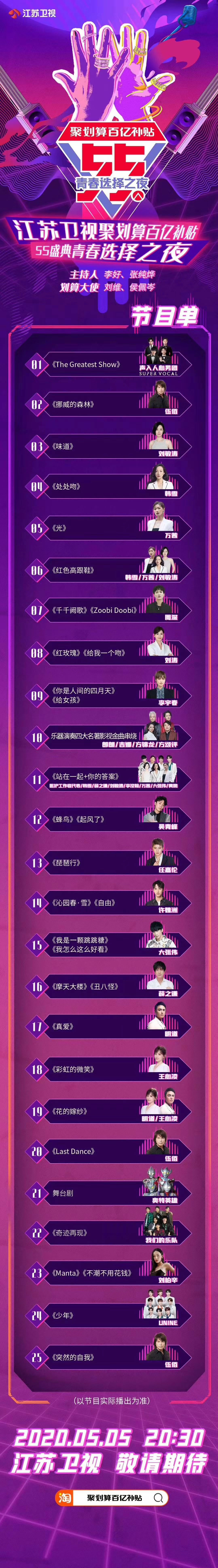 伍佰、王心凌、明道……在他们的歌声中有你的青春片段吗?今晚20:30江苏卫视55青春选择之夜,点燃青春梦,解锁回忆杀!节目单list抢先看~ 打开荔枝新闻客户端,带你直击现场,全程同步直播!