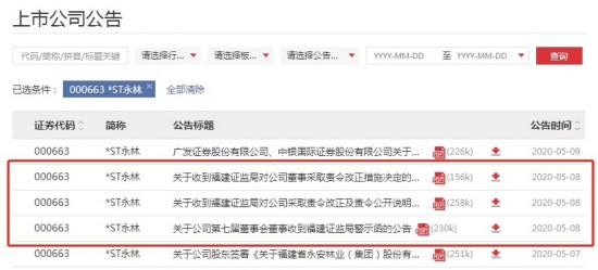 公告显示,福建省永安林业(集团)股份有限公司(后文简称“*ST永林”)于2020年5月7日收到中国证监会福建监管局下发的《关于对福建省永安林业(集团)股份有限公司采取责令改正及责令公开说明措施的决定》。