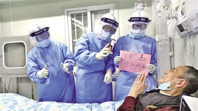3月6日,火神山医院感染三科一病区护士李芳照顾的一位老人迎来了自己87岁的生日。早在前一晚,冯晶护士长就跟火神山医院后勤联系,千方百计为老人准备了一碗荷包蛋长寿面,并在当日由护士罗妮亲自端给老人。护士们还给老人准备了一条中国红祈愿平安手环,护士罗妮向爷爷传递了衷心的祝愿“爷爷,祝您长命百岁,永远平安,早日和奶奶夫妻双双把家还!”