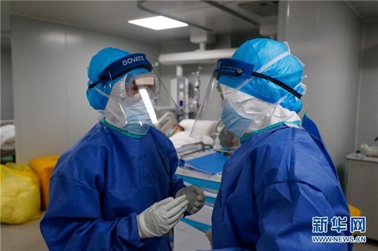 2月26日,火神山医院重症医学一科护士长陈静(左)与医生交流。 新华社发(吴浩宇 摄)