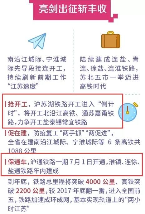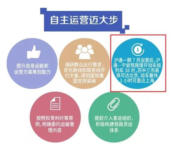 5月18日,江苏铁路集团发布省铁路集团两年来工作情况报告。其中,明确了通沪铁路一期在7月运营后,将于宁启铁路贯通运营,宁启-通沪铁路将增开动车组列车38对,届时,苏中三市高铁可达北京、动车组最快1小时可直达上海。