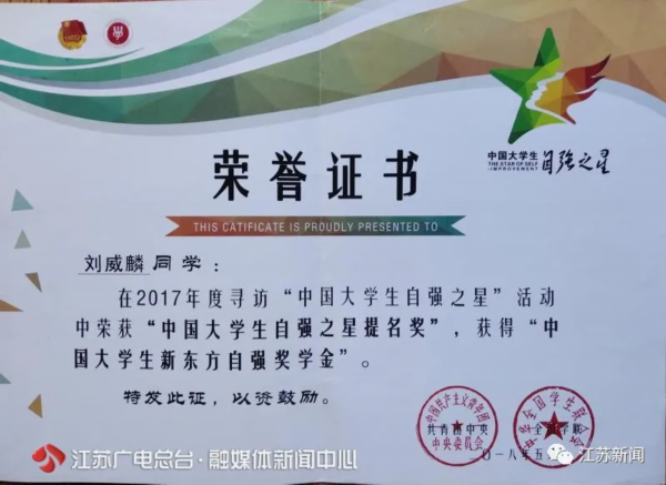 自入学以来,刘威麟一直很努力,曾获"中国大学生自强之星提名奖"、"江苏省大学生自强之星"等荣誉,并多次获得校长奖学金。