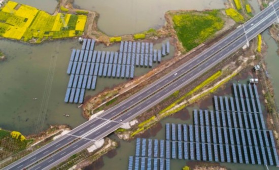 姜堰区淤溪镇甸夏村的“渔光互补”光伏电站与油菜花田交相辉映。