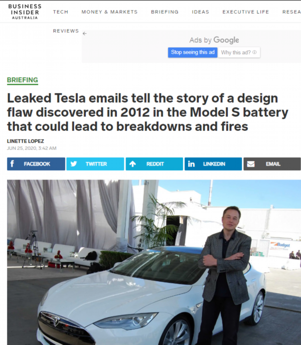 近日,外媒Business Insider报道称,特斯拉泄露邮件显示,其在2012年就知道Model S的电池冷却装置设计不当,可能因此短路甚至起火,但管理层为了产量和业绩而视而不见。