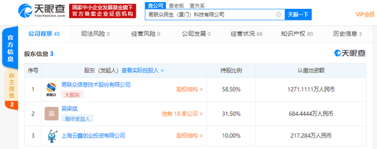 天眼查股东信息显示,该公司工商披露的股东中,A股上市公司易联众信息技术股份有限公司为该公司第一大股东,持股比例为58.50%,吴梁斌本人为公司第二大股东,持股比例为31.50%,上海云鑫创业投资有限公司为公司第三大股东,持股比例为10%。