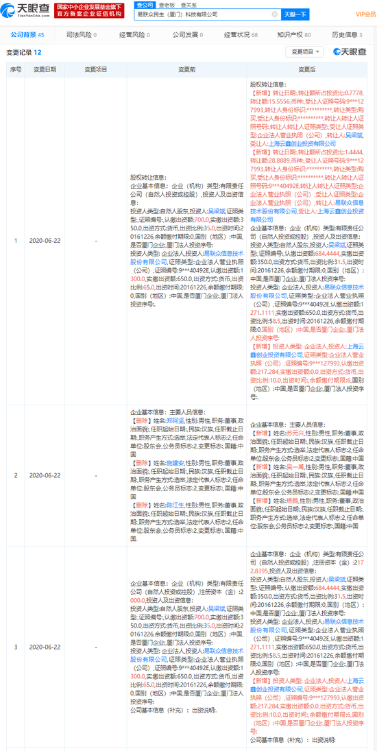 网易科技讯6月29消息,天眼查数据显示,近日,易联众民生(厦门)科技有限公司发生工商变更,新增投资人为上海云鑫创业投资有限公司,后者为浙江蚂蚁小微金融服务集团股份有限公司的全资子公司。