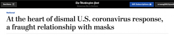 《华盛顿邮报》指出,在特朗普的狂热支持者当中,反对口罩的声音一直存在;在互联网上,关于口罩的阴谋论到处流传;在州议会大厦前,活动人士针对戴口罩行为发起抗议,呼吁“自由”。丛生的乱象中,口罩已经成为美国大选当中的一个辩题,成为了文化战争中的一个符号。