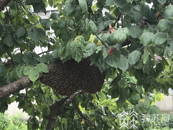 近日,家住六合龙袍渔桥社区的村民张大妈遇到一群“不速之客”,成千上万的马蜂飞到她家前院,短短几分钟就在自家果树上形成了一个脸盆大小的蜂窝,由于“蜂”数众多,无人敢靠近。