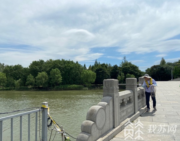 上午10点半,在南京七桥瓮生态湿地公园西门的一座桥上,记者看到,太阳暴晒之下,桥上没有一丝遮蔽,可以说是暑气蒸腾。来自江苏省水文局南京分局城区监测中心的水文监测员周飞,今年28岁,他正手执一根金属长杆,沿着石桥栏杆缓步而行,不一会儿,豆大的汗珠就顺着他的脑门滚落,这已经是他上午跑的第3个点了,今天他一共要去8个监测点。