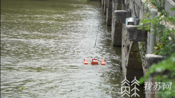 周飞告诉记者,这根长杆叫做测杆,一头拖着测绳,测绳连着三体船。三体船用来承载ADCP仪器(声学多普勒流速剖面仪),它可以测量河道流量,得到河道段面的瞬时流量。 测绳连接的三体船随着周飞的脚步,在桥下的湖面上慢慢划动。为了保证数据测量的精确性,周飞拿杆的手要稳,步子要均匀,保证船身没有太大的晃动。