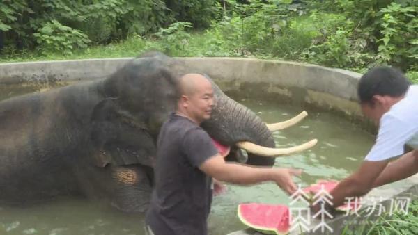 亚洲象康康也提高了福利待遇,别看它皮粗肉厚的,其实皮肤最受不了干燥,饲养员给它冲冷水澡还不够,自己每天还会主动要求下池玩水。走进水池,一个侧躺把半个身子都泡在了水里,过了一会换一边再继续躺着。光泡澡还不够,饲养员还拿来了冰镇西瓜给康康解暑。跟其他小动物不同,大象吃西瓜连皮一起吞下,这样吃起来也就快了许多,吃一个十斤重的大西瓜,康康只需要两分钟。