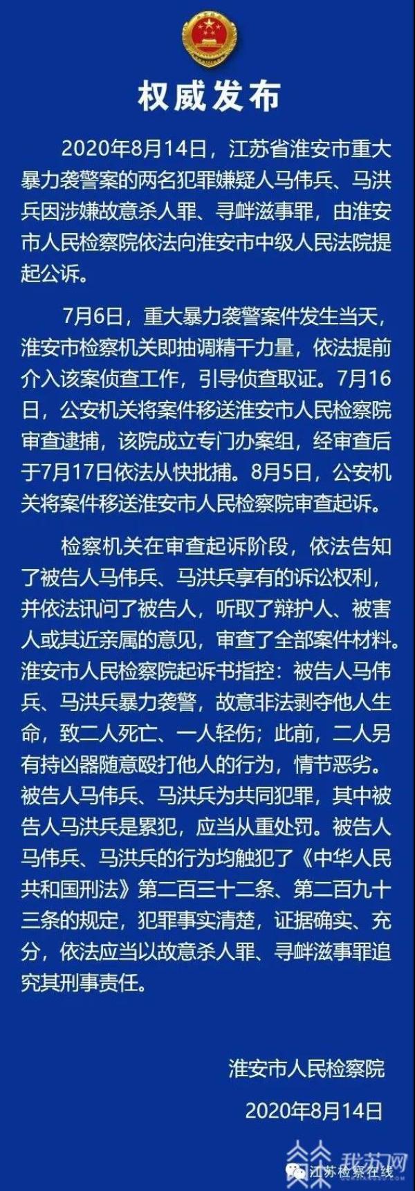 2020年8月14日,江苏省淮安市重大暴力袭警案的两名犯罪嫌疑人马伟兵、马洪兵因涉嫌故意杀人罪、寻衅滋事罪,由淮安市人民检察院依法向淮安市中级人民法院提起公诉。