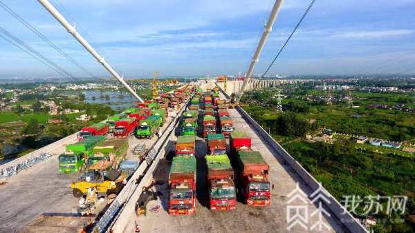 本次进行的静载试验主要是对大桥在列车荷载不同轮位作用下的应力、索力和位移等参数进行测试,采用铁路桥面和公路桥面同时加载的试验方案。铁路面上下行线试验列车均采用两个DF4机车头和39辆K13重车,公路面试验汽车共采用72辆30吨重满载汽车。为避免温度影响,静载试验均安排在夜间至凌晨时段进行。此次静载试验不仅为大桥验收交付提供依据,也为连镇高铁淮安至镇江段年底开通奠定了基础。
