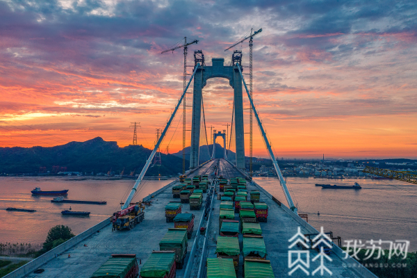 中铁大桥局连镇铁路项目部常务副经理陈明介绍说,悬索桥在荷载作用下相对容易变形而较少在铁路桥上采用,以公路桥居多,五峰山长江大桥是我国首座公铁两用悬索桥。大桥为八车道公路和四线铁路,是世界荷载最大的公铁两用悬索桥。为了判断桥梁结构的实际承载能力,评价其在设计使用荷载下的工作性能,此次静载试验加载重量达到约8200吨,创下国内悬索桥静载试验加载重量之最。