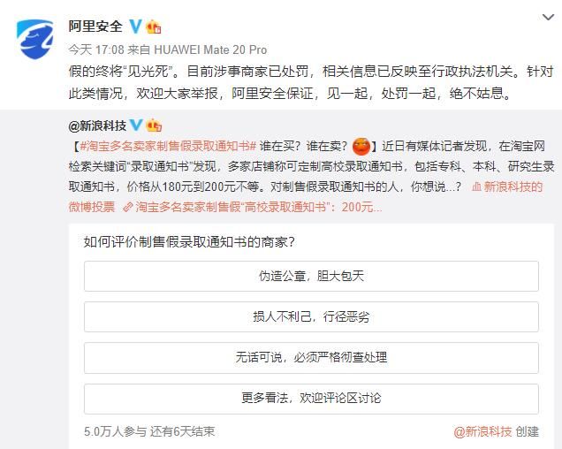 荔枝新闻讯 近日,有媒体在淘宝网检索关键词“录取通知书”时发现,多家店铺称可定制高校录取通知书。对此,阿里巴巴集团安全部20日回应:假的终将“见光死”。目前涉事商家已处罚,相关信息已反映至行政执法机关。针对此类情况,欢迎大家举报,阿里安全保证,见一起,处罚一起,绝不姑息。