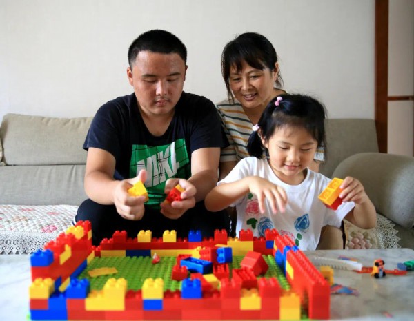 昂子喻和妹妹、妈妈一起搭积木。