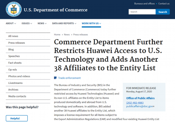美国商务部的声明表示,今年5月份美国工业和安全局(BIS)修改了生效多年的外国制造直接产品规则(FDP),以限制华为获得美国的技术和软件。在此基础上,美国工业和安全局再添加两项新规定: