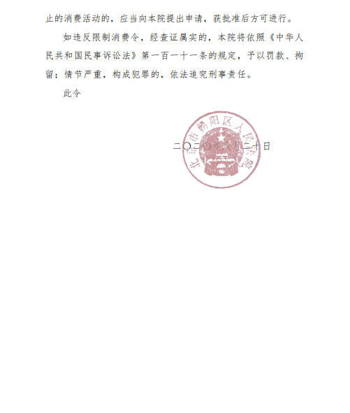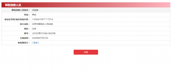 新京报快讯 据中国执行信息公开网消息,近日,北京市朝阳区人民法院下发的(2020)京0105执18829号限制消费令显示,法院于2020年07月23日立案执行申请人华强方特(深圳)动漫有限公司申请执行乐视网信息技术(北京)股份有限公司知识产权合同纠纷一案,因乐视网信息技术(北京)股份有限公司未按执行通知书指定的期间履行生效法律文书确定的给付义务,法院依照相关规定,对乐视网信息技术(北京)股份有限公司采取限制消费措施,限制乐视网信息技术(北京)股份有限公司及法定代表人刘延峰不得实施以下高消费及非生活和工作必需的消费行为。