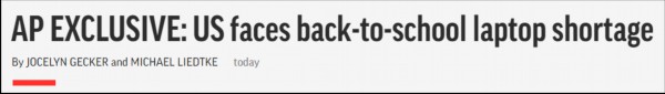 8月23日,美联社发布独家报道指出,在采访了美国20多所学校、15个州的学区、供应商、电脑公司和行业分析师后,美媒得知,全球最大的三家电脑公司——联想(Lenovo)、惠普(HP)和戴尔(Dell)已经通知学区,他们还缺近500万台笔记本电脑。