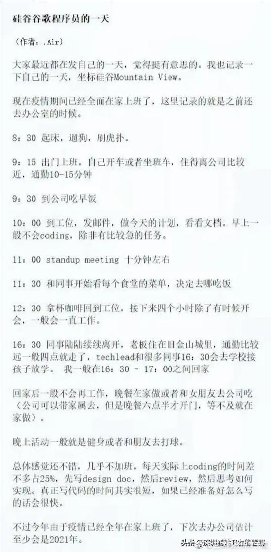 最近,有网友分享了谷歌程序员 “.Air”工作日的一天,其悠哉程度甚至超过国内朝九晚五的工作者。作者还称自己部门几乎不会加班,现在更是因为疫情索性直接在家办公,不用去公司了。