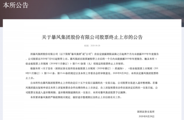 8月28日,深交所公告称,因暴风集团在法定披露期限届满之日起两个月内未披露2019年年度报告,公司股票自7月8日起暂停上市。在被暂停上市后的一个月内仍未能披露2019年年度报告,触及深交所《创业板股票上市规则(2018年11月修订)》第13.4.1条第(九)项规定的股票终止上市情形。深交所决定暴风集团股票终止上市。