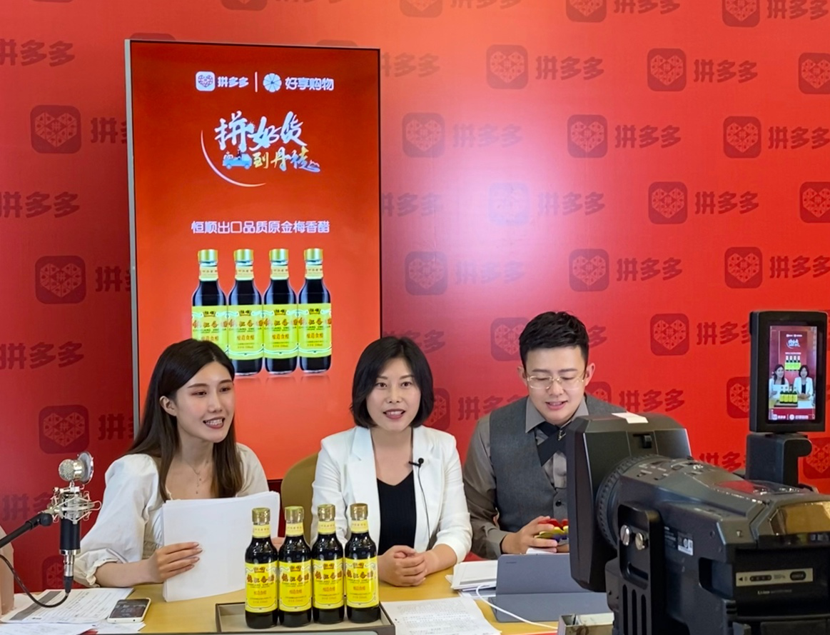 ▲8月28日,镇江市丹徒区委书记谢继步(中)走进拼多多直播间,为当地的镇江香醋代言。 (徐灿 摄)