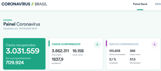 央视新闻客户端8月31日消息,截至当地时间8月30日,巴西单日新增新冠肺炎确诊病例16158例,累计确诊3862311例,新增死亡病例366例,累计死亡120828例,累计治愈3031559例。
