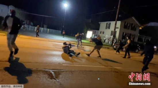资料图:当地时间8月25日,美国威斯康星州基诺沙,在非裔男子布莱克遭警察多次开枪射击引发示威抗议中,一名男子举枪射击。
