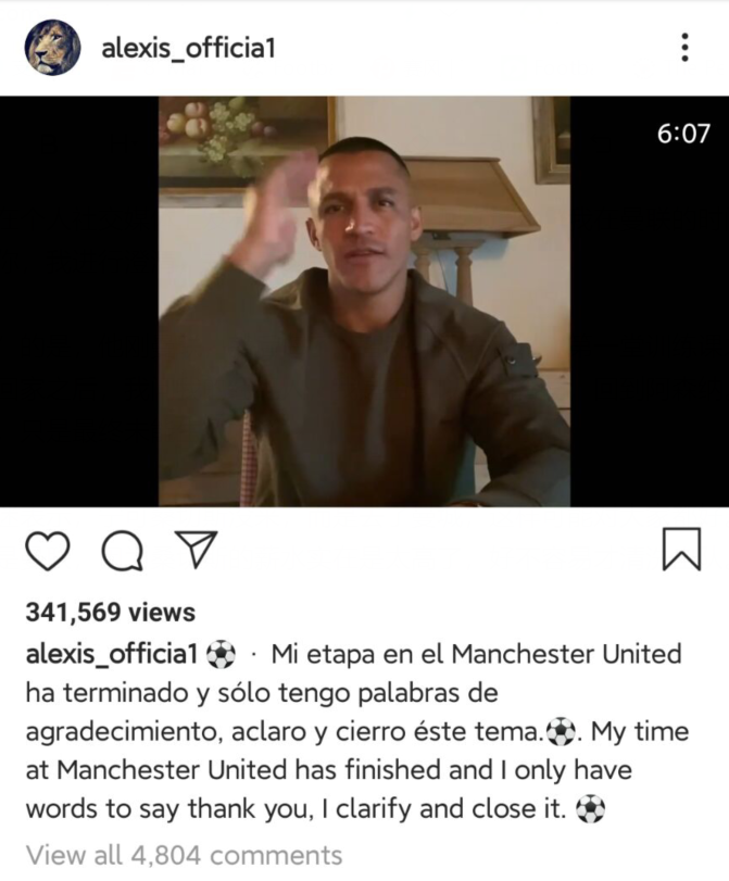 今天,桑切斯在个人社交媒体上发布了一段视频,并配文道:“我在曼联的时间已经结束了。我能说的只有谢谢你,我进行澄清,并结束这段时间。”