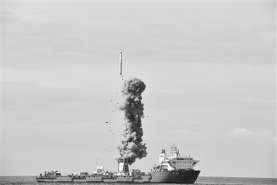 长征十一号海射运载火箭在自航驳船甲板上弹射升空的一瞬间。