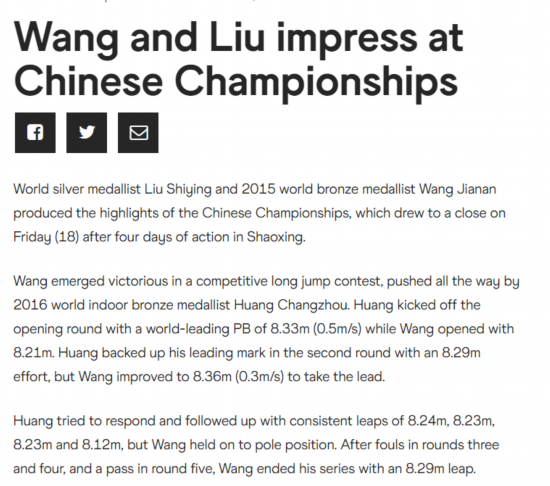 世界田联官网专门报道了中国田径锦标赛的情况,其中表现出色的跳远名将王嘉男和刘诗颖则在头条文章题目中被赞印象深刻,这是中国田径影响力不断扩大的体现,中国田径在过去几年的进步有目共睹,无疑已经成为世界田径的重要力量,期待在2021年东京奥运会中大放异彩。