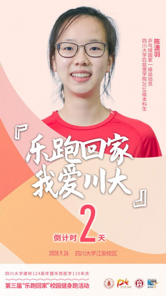 9月26日,四川大学建校124周年暨华西医学110年庆——第三届“乐跑回家”校园健身跑活动将在四川大学江安校区举行,2000名四川大学校友、教职工、学生和华西医护人员将通过跑步庆祝建校华诞。倒计时2天,一起期待吧!