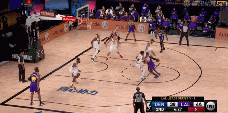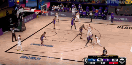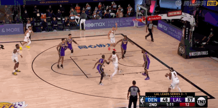 或许生涯第10次总决赛在望,老詹有点小兴奋,第三节上来仍然不可阻挡,这次连背打中投都开了,湖人68-53取 得15分领先优势。眼见掘金就要崩了,米尔萨普和格兰特送出三分止血。