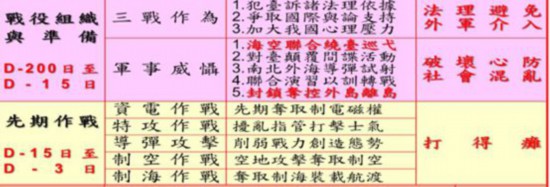 台军自己研判的情况是,通过潜伏在大陆的人力情报网,美军或其他外军军事情报部门提供的相关情况,对新闻和舆情的判断,能够提前200天摸到“风声”,提前15天进行切实准备。也就是说,台军对于解放军空军成体系转入备战状态,自认为能够提前13天(D日前12天)开始进行正常备战。随后,在D日前48小时里,台军战机提高侦巡频率,各个大队的战机转场入库入洞准备,为未来48小时的我军信火一体打击做战力保存。
