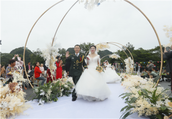 第75集团军某防空旅首届集体婚礼上,新人们穿过幸福拱门。