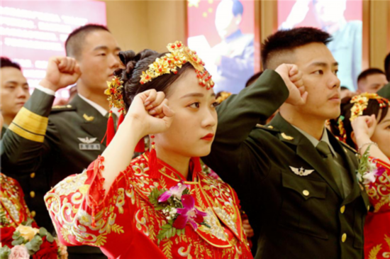 “单位在祖国71岁生日之际为我们举办集体婚礼,我感到无比自豪。作为一名飞行员,我坚持地面苦练空中精飞,早日成为飞行骨干!”手挽美丽的妻子,飞行员徐法通说。