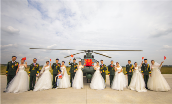 第71集团军某陆航旅19对新人手挽手,婚纱洁白、军装笔挺,浪漫与忠诚汇聚交融。他们为了爱情,在聚少离多的情况下,克服万难走到一起。婚礼专门安排了一个特殊环节:新人们通过由消防车喷洒出的水门,来到自己日常训练的武装直升机旁,在朝夕相处的战鹰前集体宣誓。