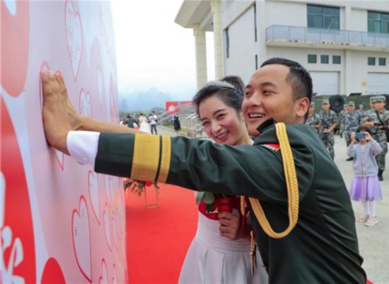 第75集团军某合成旅新人们按下象征爱情永恒的手印。
