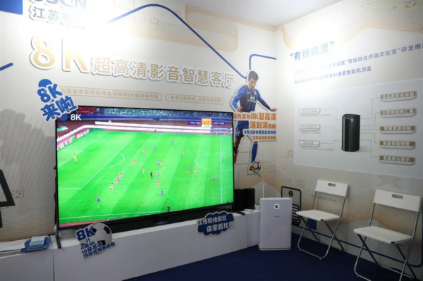 展馆现场,江苏有线国内首场8K超高清直播为本次长三角文博会点亮家庭高品质影音业务的未来。