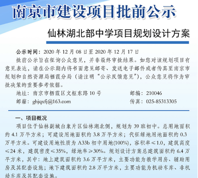 昨日(12月8日),南京市规划和自然资源局发布《仙林湖北部中学项目规划设计方案批前公示》。