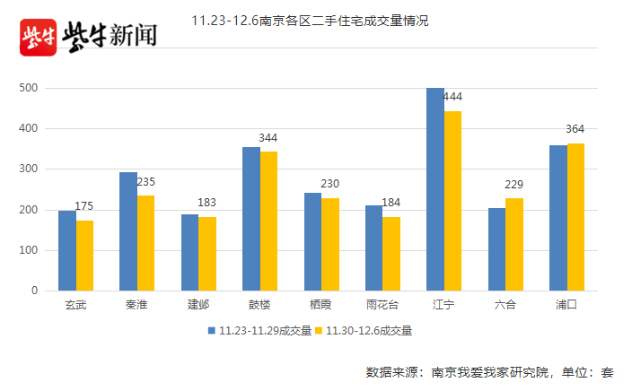 网上房地产的官方数据显示,12月首周南京二手房共成交2505套(含溧水、高淳),成交量比前一周的2677套下跌了172套,连续两周出现了下降趋势。从各区的成交情况来看,上周江宁仍位居全市之首,成交量为444套;浦口以364套排名第二位,鼓楼成交344套,排在全市第三。从环比来看,除六合、浦口外,江南6区和江宁的成交量均有所下滑。