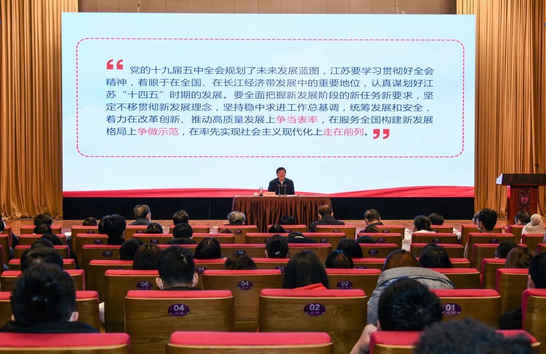 娄勤俭围绕学习领会五中全会精神和习近平总书记视察江苏重要讲话指示精神,结合“强富美高”新江苏建设实践以及今年我省统筹疫情防控和经济社会发展取得的重大成果,引用大量生动的案例事例进行系统阐述。