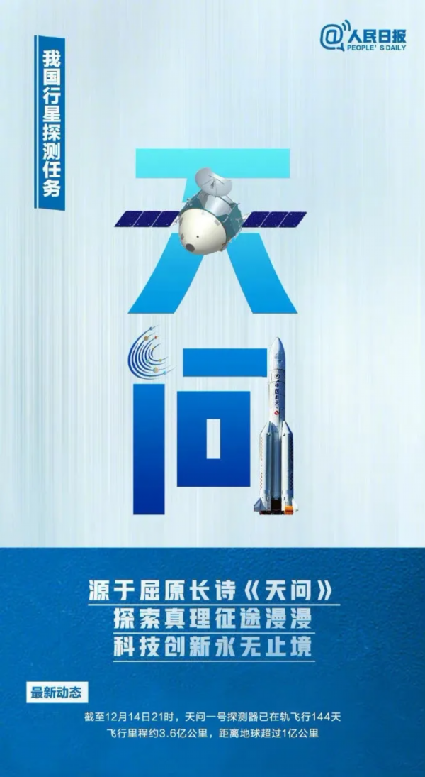 记者从国家航天局获悉:截至12月14日21时,天问一号探测器已在轨飞行144天,飞行里程约3.6亿公里,距离地球超过1亿公里,距离火星约1200万公里,飞行状态良好。