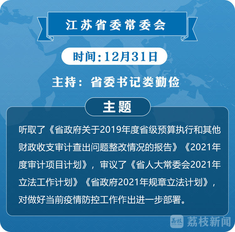 荔枝新闻讯 12月31日,省委常委会召开会议,听取了《省政府关于2019年度省级预算执行和其他财政收支审计查出问题整改情况的报告》《2021年度审计项目计划》,审议了《省人大常委会2021年立法工作计划》《省政府2021年规章立法计划》,对做好当前疫情防控工作作出进一步部署。